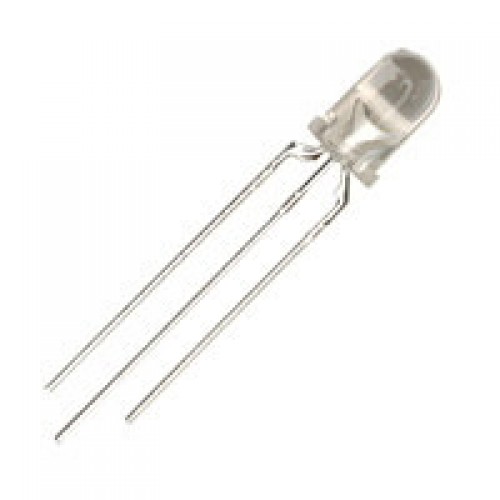 A tri-colour 5mm LED in a milky white package. Two diodes are connected in a common cathode configuration. By connecting both together a third is obtained