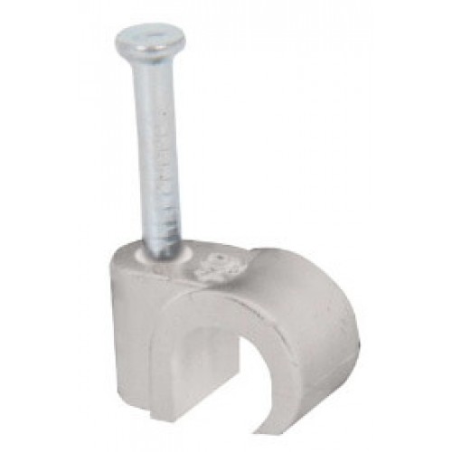 Tough cable clips with round profiles for fixing 6-7mm O.D. coaxial and satellite cable to wood, masonry and PVC. Temperature hardened nails. High density polythene clips