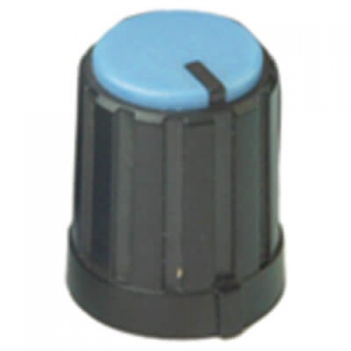 A black pointer knob with blue cap. Push on fitting for 6mm shafts