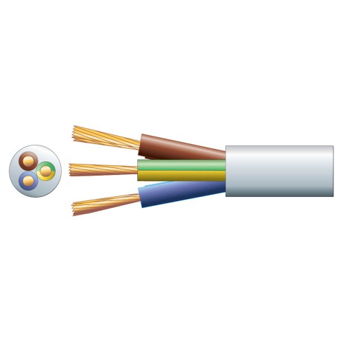 3 core pvc insulated mains flexible cable 1.25mm 13A, ref 3183Y. Supplied on 100M reels. BSI approved to BS6500, VDE approved.