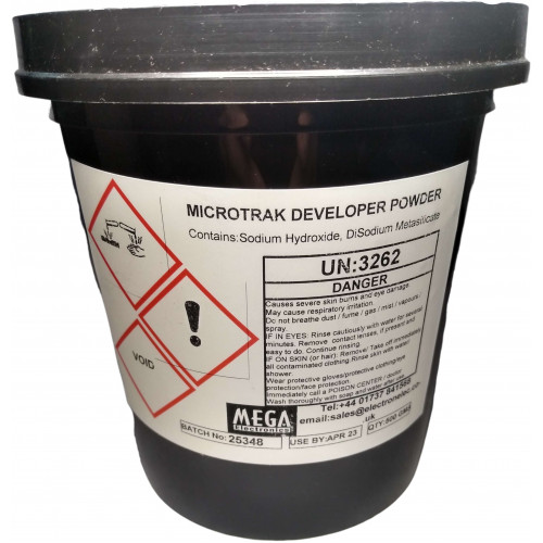 A safe stable powder developer with unlimited shelf life in unmixed form and 3 to 4 weeks in solution form. This safe developer which is suitable for all positive working photoresistsl. This developer has a safety factor which prevents over development. A board may be left immersed up to 50 times longer than the normal 20/30 seconds developing time without the risk of undercutting or thinning of the photoresist. COSHH data sheet supplied.
