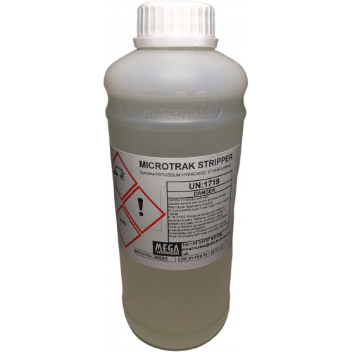 Microtrak resist stripper for removing the resist after etching. 1Ltr of Photoresist concentrate for making 5 Ltrs for use in a resist strip tank.